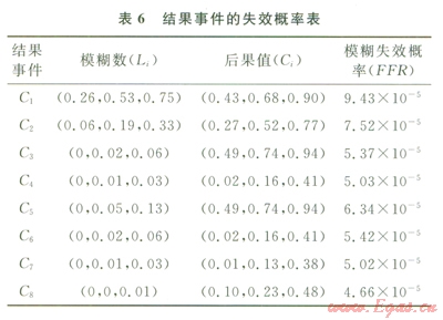 對(duì)燃?xì)庑孤┑娘L(fēng)險(xiǎn)評(píng)價(jià)可根據(jù)風(fēng)險(xiǎn)值Ri=Li×Ci,由于計(jì)算的可能值和后果都以模糊數(shù)表示,所以為對(duì)比風(fēng)險(xiǎn)大小,應(yīng)用式(6)~(9),將其轉(zhuǎn)化為表6中的各結(jié)果事件的模糊失效概率值(FFR)。