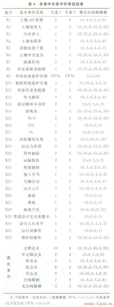 首先邀請(qǐng)有經(jīng)驗(yàn)的專家組成評(píng)價(jià)小組,冉對(duì)專家進(jìn)行權(quán)重分析,本文僅以兩位專家為例,并且賦予其相等的權(quán)重。依據(jù)故障樹中基本事件和事件樹中誘發(fā)事件的風(fēng)險(xiǎn)大小,由號(hào)家賦予每個(gè)事件相應(yīng)的三角模糊數(shù),評(píng)價(jià)結(jié)果見表4,然后根據(jù)式(5)求得聚合后的事件模糊數(shù)。