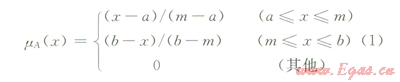 式中A是指定論域x上的模糊集;mA(x)是指工對(duì)模糊集A的隸屬函數(shù);m為模糊數(shù)A的均值;a、b分別為模糊數(shù)A的左右分布參數(shù)。
