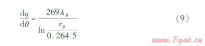 由邊界條件:當r=0.2645m時,微元弧面溫度為270℃;當r= rq時,微元弧面溫度為l℃,可求得式(8)在dq內(nèi)的解為:
