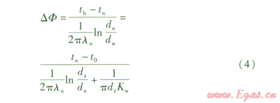 對于水平安裝供熱管道,設定絕熱層熱導率與方向無關(guān)且等于測點n方向的熱導率ln,根據(jù)式(3)與能量守恒定律,以測點所在圓為分界線,測點內(nèi)圓絕熱層與測點外圓絕熱層的熱流量相等。供熱管道單位長度熱損失DF可寫為: