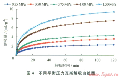 圖4為Xll064煤樣不同平衡壓力的解吸曲線,從該圖可以看出,隨著平衡壓力的增加,煤樣的解吸量明顯增大,解吸速度會(huì)隨時(shí)間逐漸放緩。