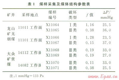 龍山礦和大眾礦均為突出礦井,在龍山礦同時(shí)具有軟硬煤的地點(diǎn)采集了4組煤樣;大眾礦煤質(zhì)較軟,采集了4組軟煤煤樣,測(cè)試煤的堅(jiān)固性系數(shù)f值和瓦斯放散初速度DP。煤樣采集信息及煤體結(jié)構(gòu)參數(shù)見(jiàn)表1。