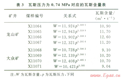 3)實(shí)驗(yàn)室研究了瓦斯含量和瓦斯壓力的相互關(guān)系,龍山礦無(wú)煙煤瓦斯壓力0.74MPa對(duì)應(yīng)的瓦斯含量為l0.9~12.6m3/t,最低為l0.9m3/t;大眾礦貧煤對(duì)應(yīng)的瓦斯含量為9.04~10.7m3/t,最低為9.04m3/t。