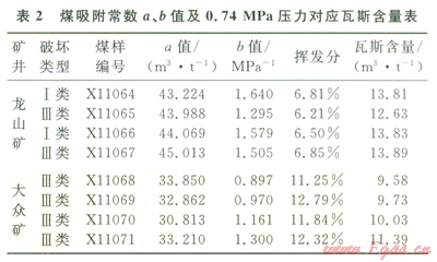 采用WY-98B型全自動(dòng)瓦斯吸附常數(shù)測(cè)定儀,測(cè)定了龍山礦和大眾礦的吸附常數(shù)a、b值和揮發(fā)分等參數(shù),測(cè)試結(jié)果見(jiàn)表2。