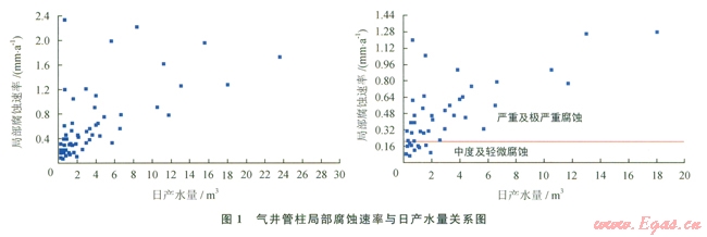 根據(jù)歷年油管腐蝕測試結(jié)果,結(jié)合氣井產(chǎn)水量對應(yīng)的最大局部腐蝕速率的影響(圖1),可以看出,氣井油管腐蝕程度與氣井產(chǎn)水量關(guān)系密切,氣井腐蝕速率隨著氣井產(chǎn)水量的增加而增長。中度及輕微腐蝕氣井主要分布于日產(chǎn)水量小于2m3的氣井,嚴(yán)重和極嚴(yán)重腐蝕氣井主要分布于日產(chǎn)水量大于2m3的產(chǎn)水氣井。