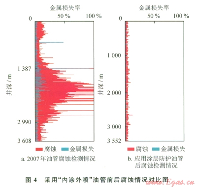 結(jié)果表明:應(yīng)用DPC內(nèi)涂層+外雙金屬復(fù)合噴涂技術(shù)油管后,檢測發(fā)現(xiàn)油管內(nèi)壁腐蝕輕微,最大腐蝕量控制在本體的l0%以內(nèi),腐蝕速率最大為0.11mm/a。通過前后兩種氣井管柱腐蝕狀況對比,發(fā)現(xiàn)該油管防腐效果良好。截至目前,該井油管使用時間已超過5年,生產(chǎn)正常。