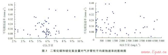 CO2和H2S含量對氣井管柱腐蝕速率的關(guān)系如圖3所示。CO2含量大于4%時,油管腐蝕速率隨CO2升高而上升。由于H2S含量比較低,其對管柱腐蝕的影響很小。