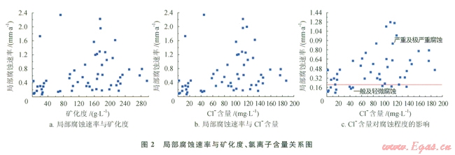 根據(jù)歷年油管腐蝕檢測結(jié)果,結(jié)合氣井產(chǎn)水量與氣井產(chǎn)出水礦化度和Cl含量對應(yīng)局部腐蝕速率的關(guān)系見圖2。