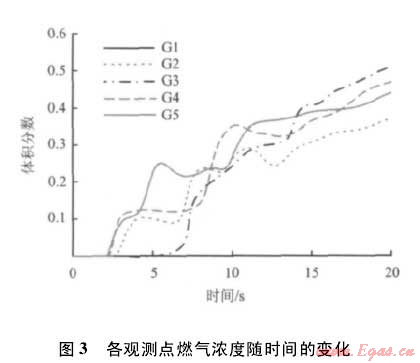 燃?xì)獾闹饕煞譃榧淄椋淄榕c空氣混合后,當(dāng)甲烷濃度處于4.6%-14.3%的爆炸極限范圍[16]內(nèi)時(shí)遇到點(diǎn)火源才有可能發(fā)生爆炸。為了研究泄漏燃?xì)獗ㄎkU(xiǎn)區(qū)域的遷移特征,圖2給了不同時(shí)刻觀測(cè)剖面上燃?xì)鉂舛燃s在5%-15%時(shí)的區(qū)域。在泄漏初始階段,爆炸危險(xiǎn)區(qū)域位于泄漏孔上部。隨著泄漏擴(kuò)散的發(fā)展,房間上方充滿大量燃?xì)?,燃?xì)庀蛳逻\(yùn)移,危險(xiǎn)區(qū)域整體向下移動(dòng),最終遷移至地面附近。同時(shí),爆炸危險(xiǎn)區(qū)域范圍隨時(shí)間呈現(xiàn)由小變大,再由大變小的變化過程,在初始泄漏階段,氣體對(duì)流擴(kuò)散和分子運(yùn)移導(dǎo)致燃?xì)鈴男孤┛谙蛑車鷧^(qū)域擴(kuò)持續(xù)擴(kuò)散,形成爆炸危險(xiǎn)區(qū)域范圍由小變大的變化過程;隨著燃?xì)庑孤┝康脑黾雍屯牧鲾U(kuò)散的增強(qiáng),絕大部分區(qū)域的燃?xì)鉂舛瘸掷m(xù)上升,燃?xì)獠粩喽逊e,爆炸危險(xiǎn)區(qū)域范圍又呈現(xiàn)由大變小的變化過程。此外,位于房間下半部的爆炸危險(xiǎn)區(qū)域的持續(xù)時(shí)間明顯長(zhǎng)于房間上半部。這說明,從爆炸危險(xiǎn)區(qū)域持續(xù)時(shí)間來看,房間下部區(qū)域更容易引發(fā)燃?xì)獗?。各觀測(cè)點(diǎn)燃?xì)鉂舛入S時(shí)間的變化如圖3所示。各觀測(cè)點(diǎn)燃?xì)鉂舛入S時(shí)間均呈曲線上升趨勢(shì),且爆炸危險(xiǎn)區(qū)域最先達(dá)到房間頂部(觀測(cè)點(diǎn)G5約在2.47s時(shí)刻到達(dá)),然后逐漸向下遷移,越向下的觀測(cè)點(diǎn),其爆炸危險(xiǎn)區(qū)域到達(dá)得越晚(觀測(cè)點(diǎn)G1約7.5s時(shí)刻到達(dá))。