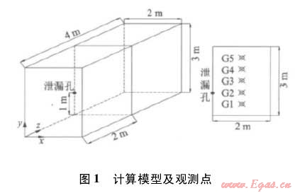 數(shù)值模擬基于流體力學(xué)守恒方程組,包括質(zhì)量守恒方程、動(dòng)量守恒方程、能量守恒方程和化學(xué)組分守恒方程。采用標(biāo)準(zhǔn)k-ε湍流模型來描述氣體的湍流流動(dòng)。結(jié)合實(shí)際民用建筑的廚房尺寸,將一密閉空間為作為研究對(duì)象,該空間長(zhǎng)、寬、高分別為4m(Z方向)、2m(X方向)、3m(Y方向),如圖1所示。假設(shè)廚房燃?xì)夤艿郎弦恢睆?/span>1cm的圓形泄漏孔位于墻壁附近,泄漏孔中心坐標(biāo)為(0,1,2)。結(jié)合我國(guó)城鎮(zhèn)民用建筑結(jié)構(gòu)燃?xì)夤艿赖墓ぷ鲏毫?,假定本文研究的燃?xì)夤艿拦ぷ鲏毫楹愣ㄖ?/span>2500Pa(表壓),泄漏孔為連續(xù)泄漏,且泄漏孔泄漏流量為恒定值。選取房間z=2m的剖面作為研究對(duì)象,著重考察爆炸危險(xiǎn)區(qū)域的遷移規(guī)律,并選取了該剖面上不同高度的五個(gè)觀測(cè)點(diǎn)(G1-G5)來分析燃?xì)鉂舛鹊臅r(shí)空分布特征,這五個(gè)觀測(cè)點(diǎn)的坐標(biāo)依次為(1,0.5,2)、(1,1,2)、(1,1.5,2)、(1,2,2)、(1,2.5,2)。計(jì)算時(shí)考慮重力加速度9.81m·s-2。燃?xì)獾闹饕煞譃榧淄?,在?jì)算中假設(shè)燃?xì)庵屑淄轶w積分?jǐn)?shù)為100%。