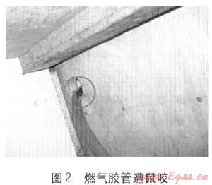 2010年11月5日,溫州市區(qū)康泰大廈一住戶(hù)廚房?jī)?nèi)發(fā)生一起燃?xì)獗ㄊ鹿?,造?人受傷、2戶(hù)建筑受損,爆炸原因系老鼠咬破膠管引發(fā)燃?xì)庑孤?。膠管被鼠咬是用戶(hù)家中安全用氣的最大隱患之一,每年冬春兩季鼠患最為嚴(yán)重。統(tǒng)計(jì)數(shù)據(jù)顯示,2009年公司供氣區(qū)域內(nèi)發(fā)生230起有關(guān)膠管隱患處警,其中膠管被鼠咬有76起;2010年共發(fā)生有關(guān)膠管隱患處警200起,其中膠管被鼠咬有93起,進(jìn)而發(fā)生爆燃的有5起。通常用戶(hù)家里所使用的燃?xì)饽z管為橡膠軟管,易被鼠咬(見(jiàn)圖2),用戶(hù)在不知道的情況下開(kāi)啟灶具開(kāi)關(guān)就會(huì)產(chǎn)生爆炸、爆燃等事故。