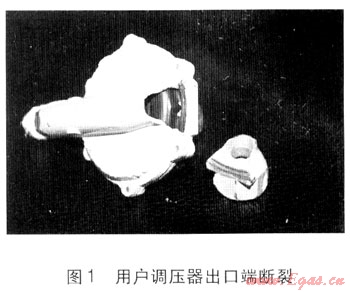 調(diào)壓器本體泄漏,包括本體進(jìn)出口端開(kāi)裂、斷裂(見(jiàn)圖1)、閥蓋破裂、本體與螺紋接頭處泄漏等。調(diào)壓器本體所用材質(zhì)主要是生鋁,韌性不足,閥體厚度(約2mm左右)不足,制造工藝缺陷造成調(diào)壓器本身質(zhì)量問(wèn)題;其次,本體與螺紋接頭采用金屬膠粘合連接,其強(qiáng)度較低,如果安裝人員沒(méi)有正確安裝操作,會(huì)導(dǎo)致粘合部位受損或嚴(yán)密性達(dá)不到要求;再次,由于采用硬連接,隨環(huán)境溫度變化和建筑物沉降,調(diào)壓器連接處發(fā)生伸縮彎曲而受應(yīng)力作用,從而造成泄漏。