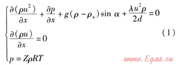 管道內(nèi)氣體流動(dòng)數(shù)學(xué)模型由動(dòng)量方程、連續(xù)性方程、狀態(tài)方程組成[10],見(jiàn)式(1)。因?yàn)楣艿纼?nèi)溫度變化很小,所以不考慮能量方程。
