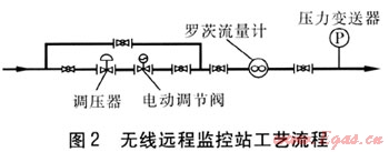 無(wú)線遠(yuǎn)程監(jiān)控站是在原有的區(qū)域中-低壓調(diào)壓站的基礎(chǔ)上,通過(guò)工藝改造增設(shè)羅茨流量計(jì)、壓力變送器、電動(dòng)調(diào)節(jié)閥、無(wú)線數(shù)據(jù)采集器(RTU)、后備電源以及無(wú)線數(shù)傳Modem構(gòu)成。無(wú)線遠(yuǎn)程監(jiān)控站工藝流程見圖2。無(wú)線數(shù)據(jù)采集器是一種具有采集、處理功能的自動(dòng)化設(shè)備,專門針對(duì)低功耗、無(wú)人值守站而設(shè)計(jì),與流量計(jì)、壓力傳感器、電動(dòng)閥門上的數(shù)據(jù)通信接口相連接,按內(nèi)置程序采集數(shù)據(jù)后,執(zhí)行操作指令上傳數(shù)據(jù),由無(wú)線數(shù)傳Modem接收信號(hào)并解碼壓縮后將信號(hào)傳回監(jiān)控中心的工控機(jī)。在后備電源的支持下,能夠保證系統(tǒng)在斷電的情況下正常運(yùn)行48h。