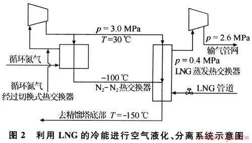 常用的空氣分離法是將空氣液化,通過氟利昂冷凍機(jī)、透平膨脹機(jī)進(jìn)行空氣的液化和分離,制成液態(tài)的氮?dú)狻⒀鯕?、氬氣等。而LNG冷熱能用于空氣分離則是通過循環(huán)氮?dú)獾睦鋮s來實(shí)現(xiàn)(見圖2)。一般來說,生產(chǎn)10×104m3的液態(tài)氣體大約需要650×104kJ的冷卻能。利用LNG的冷熱能,循環(huán)氮?dú)鈮嚎s機(jī)可小型化;因不需要冷凍機(jī),建設(shè)費(fèi)用也可相應(yīng)減少;此外,LNG作為空氣分離裝置的預(yù)冷劑,生產(chǎn)液氬的空分裝置中,利用其冷能冷卻和液化由下塔抽出經(jīng)過復(fù)熱的循環(huán)氮,可以省去氟利昂制冷機(jī)以及氮透平膨脹機(jī)組,使產(chǎn)品能耗平均降低0.5kwh/m3,裝置的投資費(fèi)用可減少10%左右,生產(chǎn)成本降低20%~30%。