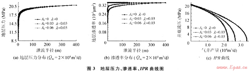 如圖3-b所示,由于上覆巖石壓力基本不變,地層中各點的有效應力值不一樣,井筒附近的有效應力大,所以其井筒附近的滲透率降低較多,而遠離井筒附近的滲透率降低較少,形成類似于壓力漏斗的“滲透率漏斗”;而不考慮應力敏感時,其地層滲透率不變。并且,當氣井以2×104m3/d生產(chǎn)時,Ak越大,地層滲透率下降越多。