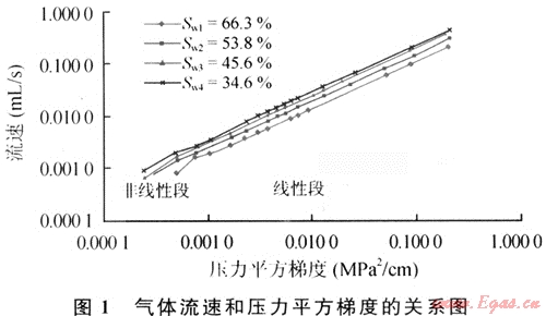 致密低滲透氣藏普遍具有低孔、低滲、束縛水飽和度高的特點,由于細小孔隙喉道處水化膜的封堵作用,氣體滲流往往具有啟動壓力梯度特征,作用于氣體兩端的壓力梯度要大于啟動壓力梯度才能流動[1];同時許多致密低滲透氣藏具有“應力敏感”特征[2]。致密低滲透儲層巖心氣體低速滲流實驗結(jié)果如圖1,在氣體流速和壓力平方梯度的關系圖上,線性段為達西滲流段,非線性段不通過坐標原點,和x軸的交點即為啟動壓力梯度,儲層含水飽和度越高,啟動壓力梯度作用才明顯。致密低滲透氣藏儲層滲透率隨有效應力的變化如圖2。可以看出在降內(nèi)壓過程中,滲透率隨有效應力的增大而減小,在儲層壓力恢復的過程,由于儲層發(fā)生了部分塑性變形,滲透率并不能恢復到初值。
