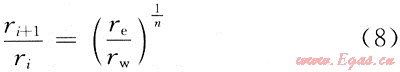 對于穩(wěn)態(tài)滲流的氣井,在離井較遠的地方,壓力變化比較緩慢;而在井的附近,壓力下降卻非常快。在用數(shù)值方法求解氣井產(chǎn)量時,采用非均勻網(wǎng)格,即數(shù)值模擬柱坐標系統(tǒng)中常用的沿徑向節(jié)點坐標分布公式: