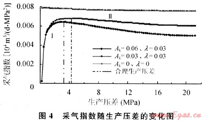 與低滲透變形介質(zhì)油藏合理生產(chǎn)壓差的定義相同,Qsc/(pe2-p22)(氣井采氣指數(shù))最大值對應的壓差即為合理生產(chǎn)壓差(圖4),當Ak=0.06、λ=0.03時,合理生產(chǎn)壓差為3.21MPa;當Ak=0.03、λ=0.03時,合理生產(chǎn)壓差為4.28MPa,應力敏感常數(shù)越大,氣井的合理生產(chǎn)壓差越小。
