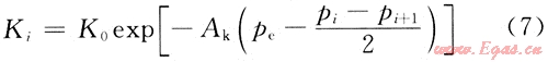通過巖心應力敏感實驗,發(fā)現(xiàn)巖石滲透率與有效應力滿足指數(shù)關系,每一個網(wǎng)格節(jié)點i的滲透率可表征為有效應力的函數(shù)[4]: