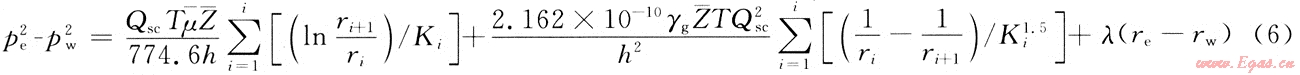 將i=3,4,…,n分別帶入式(5)中,可以得到n-2個類似的方程,并將這n-2個方程和式(3)和式(4)一起疊加,便可以得到考慮儲層變形和啟動壓力梯度、非達西流動的氣井產(chǎn)能方程: