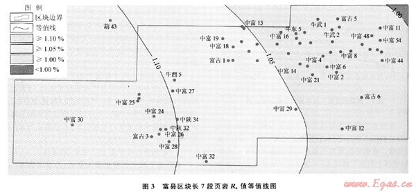 根據(jù)美國(guó)和加拿大的勘探開(kāi)發(fā)結(jié)果,形成頁(yè)巖氣的頁(yè)巖有機(jī)質(zhì)成熟度(Ro)值為0.4%~3.0%。如Barnett頁(yè)巖的成熟度就屬于中等-較高范圍,Ro為1.0%~2.1%[9]。區(qū)域上對(duì)延長(zhǎng)組有機(jī)質(zhì)熱演化的研究表明,早白堊世中期進(jìn)入成熟門(mén)限,早白堊世末期進(jìn)入大量生烴門(mén)限,古近紀(jì)進(jìn)入高成熟期。富縣地區(qū)曾經(jīng)是埋深最大的生油中心,Ro值大于1%,有機(jī)質(zhì)成熟度較高。該區(qū)中富2、中富30、葫43井主要生油巖長(zhǎng)7段鏡質(zhì)體反射率分別為1.13%、1.06%、1.10%;總體上西部頁(yè)巖有機(jī)質(zhì)演化程度高于東部(圖3)。