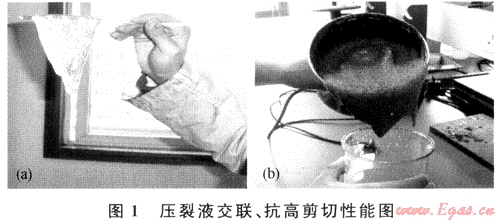 有機(jī)硼交聯(lián)劑具有可控制的延遲交聯(lián)作用時間、耐溫能力強(qiáng)和易破膠、對支撐裂縫導(dǎo)流能力傷害小等特點。廣安002-X36井儲層溫度雖然只有65.2℃,但施工規(guī)模大,因此選用有機(jī)硼交聯(lián)劑。通過對有機(jī)硼交聯(lián)劑進(jìn)行精細(xì)優(yōu)化,模擬現(xiàn)場壓裂液交聯(lián)的性能見圖1-a,模擬現(xiàn)場高砂比高剪切的黏彈性見圖1-b(實驗條件:濃度800kg/m3,采用25000r/min的粉碎機(jī)模擬高剪切,平均線速度為250m/s,高剪切時間為1min)。實驗結(jié)果表明,壓裂液交聯(lián)具有良好的挑掛性、黏彈性、良好抗高剪切能力和良好的懸砂性能。