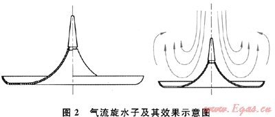 1) 采用創(chuàng)新設(shè)計的傘形氣流旋水子部件,其結(jié)構(gòu)及效果示意圖如圖2所示,以達到煙氣含濕的目的,從而保證上盤管受熱面的安全運行,強化傳熱。該技術(shù)方案的優(yōu)點在于:①當高溫煙氣與水大面積接觸時發(fā)生了熱質(zhì)交換,加熱并部分蒸發(fā)了水,適當降低了煙溫,使流經(jīng)上盤管受熱面的煙氣溫度不致過高,能夠控制在天然氣燃點溫度650℃以下[12],從而確保加熱氣化裝置的安全運行;②因為上盤管內(nèi)的工質(zhì)是溫度很低的LNG,適當降低的煙溫將使上盤管受熱面內(nèi)外的工質(zhì)溫差不致太大,從而避免了盤管因熱應力損壞,也避免了必須采用優(yōu)質(zhì)鋼材而使造價上升;③帶有水滴、霧和蒸汽的濕煙氣在換熱時,發(fā)生凝結(jié)放熱,從而有效地提高了傳熱效果。該技術(shù)是原始創(chuàng)新技術(shù),因此采用該技術(shù)的LNG加熱氣化裝置是一種全新的設(shè)計。