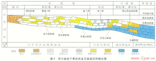 龍王廟期從盆地的西部到奉節(jié)—石柱—三匯—古藺一線發(fā)育內(nèi)緩坡相。盆地內(nèi)陸源物質(zhì)含量少,僅在盆地西部和西北部有少量沉積,發(fā)育潮坪亞相,主要巖性為紫紅色、褐灰色、灰色泥巖、砂巖,深灰色泥質(zhì)云巖、泥質(zhì)泥晶云巖,沉積動(dòng)力以潮汐的作用為主,能量一般不強(qiáng);川東凹陷區(qū),屬于內(nèi)緩坡的低洼地帶,因受兩側(cè)隆起區(qū)阻擋作用,水體循環(huán)不暢,以靜水沉積為主,鹽度略高,局部地區(qū)甚至出現(xiàn)咸化和蒸發(fā)作用,巖性以灰色、深灰色泥粉晶云巖、含泥質(zhì)條帶泥晶云巖為主,部分地區(qū)發(fā)育膏巖、鹽巖(如臨7井);川中川西寬緩隆起區(qū),是內(nèi)緩坡顆粒灘發(fā)育的主要地區(qū)。隆起區(qū)地形相對(duì)較高,在波浪、潮汐的作用下,水體能量較強(qiáng)的位置發(fā)育顆粒灘,巖性以灰色、深灰色亮晶砂屑云巖、殘余砂屑云巖、殘余礫屑云巖,以及細(xì)晶云巖為主,見少量鮞粒云巖及生屑云巖,交錯(cuò)層理發(fā)育,為顆粒灘亞相;在整個(gè)隆起區(qū),顆粒灘亞相與灘間海亞相具體發(fā)育區(qū)域很難加以區(qū)分,在橫向上多表現(xiàn)為灘間海發(fā)育于顆粒灘之間,縱向上夾于大套顆粒灘之間。灘間海亞相水體環(huán)境相對(duì)安靜,以細(xì)粒沉積為主,由生物擾動(dòng)泥晶云巖、含不規(guī)則泥質(zhì)紋層泥晶云巖和扁條狀泥晶云巖組成,發(fā)育條帶狀構(gòu)造、生物擾動(dòng)斑、生物潛穴構(gòu)造等是該亞相的典型特點(diǎn)。