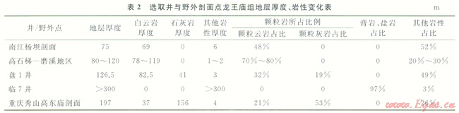 從選取的井并結(jié)合野外剖面點(diǎn)的巖性組合、變化情況等可以看出(表2),除去臨7井為膏鹽沉積外,龍王廟組沉積自西向東隨著水深的變化,整體厚度變大,顆粒灘沉積厚度也變大,沉積巖性的變化是由全部的白云巖沉積到開始出現(xiàn)石灰?guī)r沉積,最后到石灰?guī)r占整個(gè)龍王廟組的大部分,只有上部存在少量的白云巖的一個(gè)漸變過程。高石梯 磨溪地區(qū)是白云巖灘最發(fā)育的地區(qū),秀山高東廟剖面代表的中緩坡區(qū)域沉積的灘體多為石灰?guī)r灘。