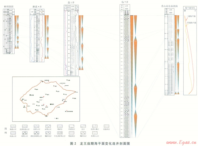 碳酸鹽巖沉積作用對(duì)相對(duì)海平面變化的響應(yīng)極為敏感,相對(duì)海平面升降發(fā)生變化,沉積巖性就有所不同,表現(xiàn)出不同的旋回序列[28]。為此,選取3 口井進(jìn)行巖心觀察并踏勘實(shí)測(cè)2條野外剖面,對(duì)龍王廟組沉積巖性組合進(jìn)行了分析,劃分單井、野外剖面沉積旋回,對(duì)連井剖面上的沉積旋回進(jìn)行橫向?qū)Ρ?,以此?lái)反映海平面的變化情況(圖2)。如圖2所示,整個(gè)龍王廟期海平面都具有快速海侵、低速海退的特點(diǎn),次級(jí)海平面變化特征也一致。