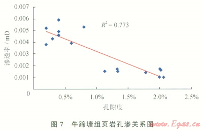 該區(qū)牛蹄塘組頁巖孔隙度為1.3%~25.6%,平均為8.24%,孔隙度中等;滲透率介于0.001~0.017mD,平均為0.008mD,滲透率極低。牛蹄塘組頁巖孔隙度與滲透率之間呈線性負相關(guān)關(guān)系,如圖7所示。