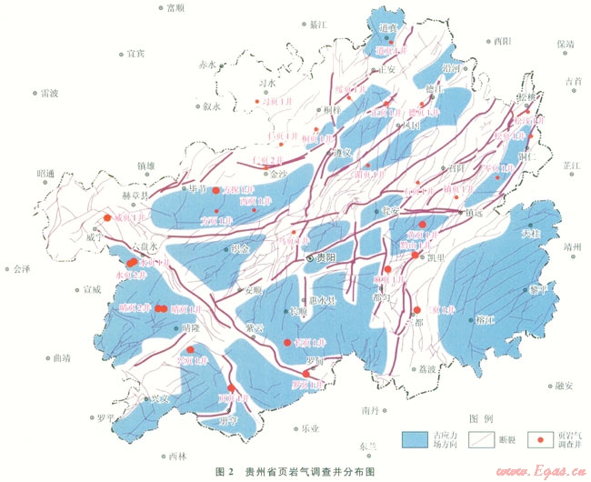 為改善能源結(jié)構(gòu),改變貴州省“無油少氣”的局面,貴州省人民政府于2012年3月開展了貴州省頁巖氣資源調(diào)查評價項目,針對貴州省黑色頁巖目的層,施工了27口調(diào)查井(圖2)。本文的主要數(shù)據(jù)即來源于《貴州省頁巖氣資源調(diào)查評價報告》,所公布的數(shù)據(jù)為將國內(nèi)有資質(zhì)的測試單位與國外測試機構(gòu)提供的數(shù)據(jù)比較修正后的結(jié)果。