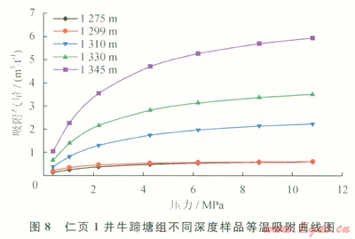 仁頁l井樣品等溫吸附實驗共測定7個平衡壓力點,每個壓力點達到平衡的時間約為12h,然后再增壓到下一個壓力點,實驗采用的甲烷氣濃度均大于99.999%。仁頁l井樣品等溫吸附曲線見圖8。