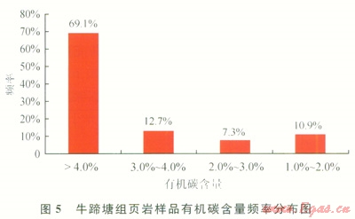 牛蹄塘組干酪根有機顯微組分以腐泥無定型和腐殖無定型為主,前者相對豐度為11%~92%,平均為49%;后者相對豐度為8%~85%,平均為48%。干酪根類型指數(shù)為51~96,干酪根類型以腐泥型和偏腐泥混合型為主。綜合分析認為:貴州省牛蹄塘組含氣頁巖的母源主要為藻類等低等水生生物,生烴能力較強。通過對牛蹄塘組地表露頭和鉆孔巖心樣品的有機碳含量測試,發(fā)現(xiàn)頁巖有機碳含量范圍為0.7%~14.6%,平均為5.2%,主頻在大于4.0%的區(qū)間(圖5)。