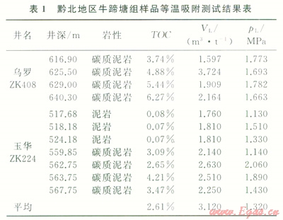 從表l可見,3件樣品有機碳含量小于1.5%,平均蘭氏體積(VL)為1.79m3/t,平均蘭氏壓力(pL)為1.32MPa;10件樣品有機碳含量大于1.5%,平均VL為3.12m3/t,平均pL為l.34MPa。綜合上述測試結(jié)果,牛蹄塘組頁巖模擬最大吸附能力平均為3.12m3/t。