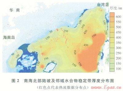 南海北部陸坡區(qū)水深變化范圍介于300~3500m之間,海底溫度介于1.45~9.00℃,而且與水深有很好的相關(guān)性。熱流分布較復(fù)雜(20~170mW/m2)。利用Miles[9]提出的海水中甲烷穩(wěn)定帶邊界曲線方程,以孔隙水鹽度為3.5%,氣體為純甲烷為約束條件,并根據(jù)熱流數(shù)據(jù)、熱導(dǎo)率、水深、海底溫度等參數(shù)進(jìn)行了穩(wěn)定帶厚度估算。計(jì)算結(jié)果表明,南海北部陸坡水合物穩(wěn)定帶厚度介于0~350m,在水深較大海盆區(qū)可超過(guò)500m(圖2),在水深小于500m的區(qū)域基本不具備形成水合物的條件。穩(wěn)定域厚度與水深變化呈正相關(guān)關(guān)系,而且水合物穩(wěn)定域受熱流變化驅(qū)動(dòng)明顯,穩(wěn)定域厚度的變化梯度與熱流值變化梯度有很大相關(guān)性,熱流值變小的地方穩(wěn)定域厚度變?nèi)?,呈?fù)相關(guān)關(guān)系。