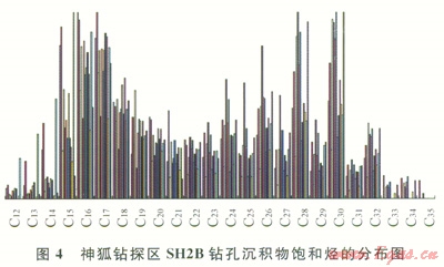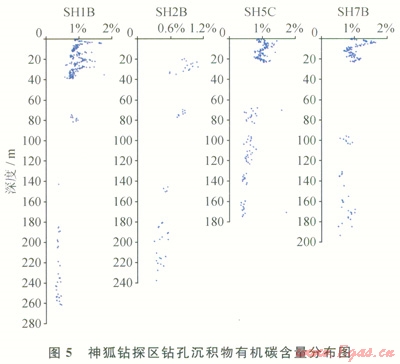 在南海北部陸坡淺表層沉積物有機(jī)質(zhì)中正構(gòu)烷烴基本為雙峰形,表現(xiàn)為海相浮游動(dòng)物、陸源高等植物混合母源特征。神狐鉆孑L沉積物有機(jī)質(zhì)正烷烴為雙峰形分布特征(圖4)。第一主峰碳數(shù)為C17~C19,代表海相浮游動(dòng)物和藻類(lèi),第二主峰碳數(shù)為C29或C31來(lái)源于陸源高等植物。其輕重?zé)N比值C21-/C22+介于0.06~5.73,有機(jī)質(zhì)d13C值為-17.3‰~-22.8‰,表明總體上以海相浮游動(dòng)物和藻類(lèi)為主,局部存在陸源有機(jī)質(zhì)。鉆孔沉積物TOC介于0.29%~1.77%,各鉆孔頂部層段TOC明顯表現(xiàn)出在高值區(qū)振蕩變化特征,并隨深度的增加TOC值逐漸降低,而到一定深度后,TOC基本保持穩(wěn)定(圖5)。這種有機(jī)碳系統(tǒng)地向下減少是早期成巖階段有機(jī)質(zhì)氧化分解的結(jié)果[17]。由于鉆孔淺部沉積物埋藏時(shí)間短,有機(jī)質(zhì)消耗較少,TOC與沉積物中原始含量比較接近,平均值達(dá)1.2%;而下部層段的有機(jī)碳為經(jīng)過(guò)早期成巖階段硫酸鹽還原和微生物發(fā)酵而大量消耗后的穩(wěn)定殘留有機(jī)碳,有機(jī)碳轉(zhuǎn)化率在30%~61%,大多轉(zhuǎn)化為生物甲烷氣,是形成水合物的主要?dú)怏w來(lái)源。神狐鉆孔沉積物有機(jī)質(zhì)中含有豐富的烷基苯系列化合物,以短鏈的烷基苯同系物優(yōu)勢(shì)為特征,含少量對(duì)熱演化敏感的較長(zhǎng)鏈的烷基苯同系物,表明有機(jī)質(zhì)熱演化程度很低。此外,部分樣品中存在重排甾烷和4-甲基甾烷,是典型的微生物作用活動(dòng)標(biāo)志,這與鉆探證實(shí)的水合物主要為微生物氣特征是一致的。