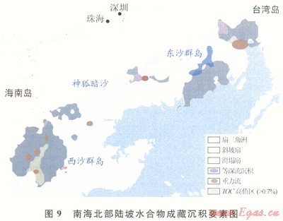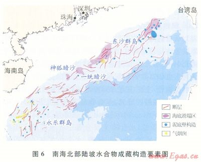 2)南海北部陸坡從西部 中部一東部體現(xiàn)出不同的地質(zhì)構(gòu)造特點(diǎn),其強(qiáng)烈差異性對(duì)水合物的富集成藏產(chǎn)生深刻的影響。東部以臺(tái)西南盆地北緣成藏條件最為優(yōu)越,水合物主要通過(guò)氣體的垂向與側(cè)向結(jié)合運(yùn)聚方式成藏,為復(fù)合型水合物發(fā)育的有利區(qū);中部以珠江口盆地白云凹陷南坡為代表,水合物主要通過(guò)氣體的側(cè)向運(yùn)聚模式成藏,驅(qū)動(dòng)力受淺層流體勢(shì)控制明顯,為分散型水合物發(fā)育區(qū);西南部以瓊東南盆地的深水帶成藏條件優(yōu)越,新近紀(jì)來(lái)構(gòu)造沉降速率較大,沉積厚度大,泥底辟和氣煙囪體發(fā)育,對(duì)水合物成藏控制明顯,水合物主要通過(guò)氣體的垂向運(yùn)聚模式成藏,有利于發(fā)育滲漏型水合物藏。