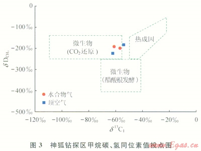 天然氣水合物氣體成因、來(lái)源及供給潛力是水合物成藏研究的最基本問(wèn)題,它決定著水合物形成的物質(zhì)基礎(chǔ)及礦藏的資源潛力。深部的熱成因氣以及由水合物穩(wěn)定帶下部向上運(yùn)移的生物氣對(duì)于形成水合物是必需的[10],不同成因類(lèi)型的烴類(lèi)氣體具有不同的形成機(jī)理和運(yùn)聚方式,并影響水合物的成藏和分布。目前世界各地發(fā)現(xiàn)的水合物大多數(shù)由微生物氣生成,僅墨西哥灣、黑海、麥肯齊三角洲等地區(qū)的水合物是由熱解氣或混合氣生成的。因此,生物成因氣在水合物成藏研究中得到了較大的關(guān)注。由于頂空氣代表充填在沉積物孔隙或裂隙中的游離氣,與水合物礦藏氣體的成因關(guān)系密切,近年對(duì)南海北部陸坡大量淺表層沉積物(海底以下0~10m)中頂空氣的測(cè)試分析結(jié)果表明,頂空氣中的d13C1值介于-102.6‰~-24.0‰,平均值為-71.1‰,C1/(C2+C3)值介于6~84659,dD值介于-180‰~145‰,研究表明氣體來(lái)源具有多源性,而且在不同區(qū)域有所差別。東沙海域頂空氣的d13C1值為-102.6‰~-38.2‰,平均值為-78.5‰,是以微生物氣為主的混合氣;西沙海域頂空氣d13C1值為-94.2‰~-71.4‰,平均值為-85.5‰,為微生物氣。從神狐鉆探區(qū)情況看,水合物樣品中的烴類(lèi)氣體以甲烷為主,甲烷含量高達(dá)99.89%和99.91%,C1/(C2+C3)值分別為911.7和1094,d13C1值為-56.7‰和-60.9‰,dD值為-199﹪和-180‰;2個(gè)頂空氣樣品的甲烷含量分別達(dá)99.92%和99.96%,C1/(C2+C1)值分別為1373.5和2447,d13C1值為-62.2‰和-54.1‰,dD值為-225‰和-191‰。神狐鉆探區(qū)呈現(xiàn)以微生物氣為主的混合氣特征[11-12],根據(jù)甲烷碳、氫同位素特征分析,主要為C0。還原型甲烷(圖3),水合物具有自生自?xún)?chǔ)原地附近運(yùn)聚的成藏特征[13]。