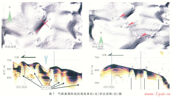 氣煙囪作為超壓流體泄壓的通道,將大量氣體運(yùn)移到淺部穩(wěn)定域中形成水合物礦藏,部分天然氣滲漏導(dǎo)致在海底形成冷泉噴口、麻坑、匠狀體、碳酸鹽巖匠等并引起海底微地貌的變化,在其周?chē)植加写罅咳缇⑷湎x(chóng)類(lèi)、雙殼類(lèi)等組成的以溢出天然氣為營(yíng)養(yǎng)源的生物組合。例如,在南海東北部陸坡廣泛發(fā)育海底麻坑、丘狀體、自生碳酸鹽巖結(jié)殼等微地貌標(biāo)志(圖7),表明該區(qū)存在著大規(guī)模的海底滲漏現(xiàn)象。2004年中德合作SO177航次在該海域也發(fā)現(xiàn)了大量的結(jié)核狀、結(jié)殼狀或管狀白生碳酸巖鹽和典型的化能生物群落(雙殼類(lèi)生物和管狀蠕蟲(chóng)類(lèi)及厭氧菌席)。
