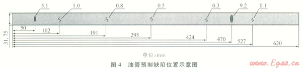 取一根實(shí)際作業(yè)使用過,長度為620mm的連續(xù)油管,利用線切割工藝在油管上預(yù)制了裂縫深度分別為0.1mm、0.3mm、0.5mm、0.8mm、1mm共5個(gè)缺陷(圖4)。
