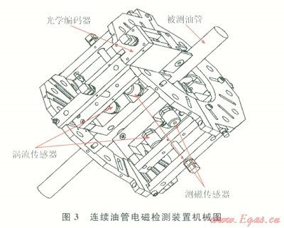 連續(xù)油管電磁檢測(cè)系統(tǒng)主要由上位機(jī)、檢測(cè)單元、數(shù)據(jù)采集和信號(hào)分析處理子系統(tǒng)、數(shù)據(jù)通信子系統(tǒng)構(gòu)成(圖3)。其中,檢測(cè)單元主要由磁法檢測(cè)儀、橢圓度測(cè)量單元、旋轉(zhuǎn)編碼器定位單元、數(shù)據(jù)采集單元組成。微磁檢測(cè)單元中的6個(gè)磁通門測(cè)磁傳感器和用于橢圓度測(cè)量的6個(gè)電渦流傳感器都是相互獨(dú)立且由相對(duì)應(yīng)的軟件調(diào)試、控制,這樣可以保證即使在其中一個(gè)傳感器出現(xiàn)問題也不會(huì)影響整個(gè)系統(tǒng)的正常運(yùn)行。圖2是用于將測(cè)磁傳感器、渦流傳感器、光學(xué)編碼器等3種探頭安裝于連續(xù)油管作業(yè)車上實(shí)現(xiàn)在線檢測(cè)的裝置機(jī)械圖。圖3中標(biāo)出了3種探頭的安裝位置。