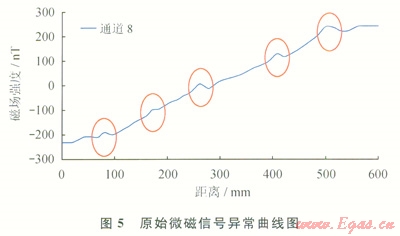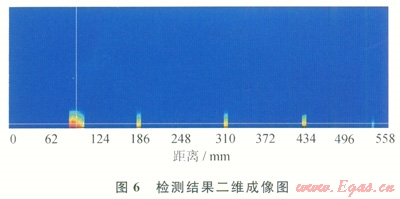 實(shí)驗(yàn)過程中,連續(xù)油管以1m/s的速度(實(shí)際作業(yè)時(shí)的速度)在機(jī)械裝置中抽動(dòng)。圖5是某通道原始磁信號(hào)曲線,可以看出分別在95mm、185mm、298mm、421mm、525mm處出現(xiàn)了向上(因?yàn)橛镁€切割預(yù)制的缺陷類似裂紋、腐蝕缺陷)的磁信號(hào)異常,這就是工件上所預(yù)制的5個(gè)人工缺陷。圖6檢測(cè)結(jié)果二維成像圖更加明顯,直觀表示了這些缺陷和大小。圖4表明了5個(gè)缺陷在油管上準(zhǔn)確位置分別是l02mm、191mm、295mm、424mm、527mm,這與實(shí)際檢測(cè)的位置相比最大絕對(duì)誤差為7mm(第1個(gè)缺陷),相對(duì)誤差不到1%。