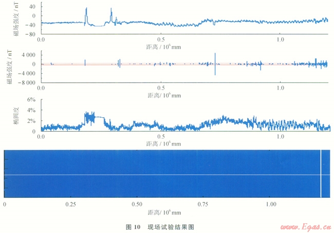 在重慶某井進(jìn)行了在線檢測(cè)現(xiàn)場(chǎng)試驗(yàn)(圖9),檢測(cè)長度為6000m,檢測(cè)結(jié)果如圖10所示,圖10中從上到下4個(gè)部分為原始信號(hào)曲線、處理信號(hào)曲線、橢圓度曲線、二維成像圖。從圖10中所顯示的二維缺陷成像圖可以看出,油管沒有大的缺陷,僅僅在被檢油管的181m處存在深度為0.5mm、面積為40mm2的表面細(xì)微損傷。通過橢圓度曲線可以看出,被檢油管1669.6m處橢圓度為4.9%,1688.5m處橢圓度為4.5%,1700.5m處橢圓度為4.2%,其他各處橢圓度均小于4.0%,與實(shí)際油管的損傷情況一致。