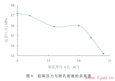 根據(jù)射孔密度與起裂壓力的關(guān)系(圖6) [7-8],隨著射孔密度的增加,裂縫起裂(破裂)壓力呈降低趨勢(shì)。當(dāng)孔密從6~16孔/m變化時(shí),起裂壓力降低不明顯,但從16~20孔/m變化時(shí),起裂壓力顯著降低。在考慮套管強(qiáng)度條件下,元壩陸相井目的層射孔密度都選擇為16孔/m。