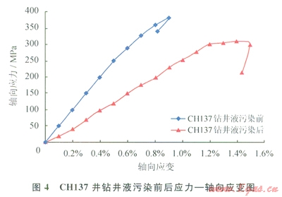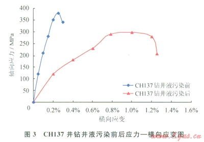 地層條件下,鉆井液浸泡對(duì)巖石三軸力學(xué)參數(shù)有較大影響(圖3、4)。由圖3、4可以看出,在50MPa壓力下,巖樣經(jīng)過(guò)5d、10d的鉆井液浸泡后,巖石抗壓強(qiáng)度和彈性模量顯著下降,而泊松比增大(CHl37井鉆井液浸泡前泊松比為0.28;鉆井液浸泡后泊松比為0.67),使得巖石破裂時(shí)橫向變形和軸向變形增加,增加了巖石抵抗破裂的能力。表明泊松比增加,巖石破裂壓力增加。