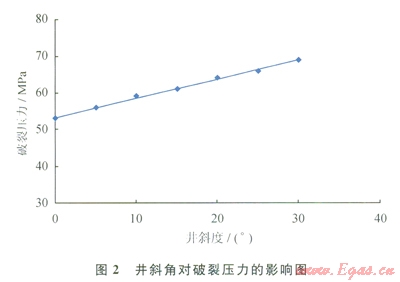 在鉆井過(guò)程中,若井眼方向與地層垂向應(yīng)力方向不平行,會(huì)導(dǎo)致壓裂施工時(shí)破裂壓力偏高(圖2)。由圖2可見(jiàn),隨著井斜角增加,破裂壓力相應(yīng)增加。元壩陸相有些井是斜井或水平井,也是引起儲(chǔ)層高破裂壓力的原因之一。如YB2-側(cè)1井珍珠沖組一須二段下層、YL6井須二段、YL10井珍珠沖組和須二段、YL601H井須二段、YL701井須三段上層等,這些井都是斜井或水平井,井斜也引起破裂壓力明顯升高,破裂壓力梯度為0.027~0.037MPa/m。