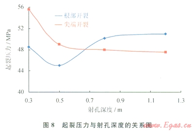 根據(jù)裂縫起裂壓力與射孔深度的關(guān)系(圖8) [7],從射孔根部起裂時(shí),隨著孔深增加,起裂壓力先減小后增加,射孔深度為0.5m時(shí),起裂壓力最低。因?yàn)榭咨钶^小時(shí),鉆井引起的近井筒應(yīng)力變化沒(méi)消除,限制了裂縫起裂,所以起裂壓力增加;當(dāng)孔深增大時(shí),孔眼尖端不受近井筒應(yīng)力的影響,所以孔眼根部起裂壓力降低。當(dāng)射孔深度超過(guò)0.5m時(shí),孔眼尖端與根部的應(yīng)力區(qū)相互影響較小,起裂壓力增加;但當(dāng)孔眼深度達(dá)到0.8m后,起裂壓力增加不明顯。表明孔深達(dá)到一定深度以后,孔眼尖端與根部應(yīng)力相互影響消失,起裂壓力小再隨孔深增加而增加或增加不明顯。